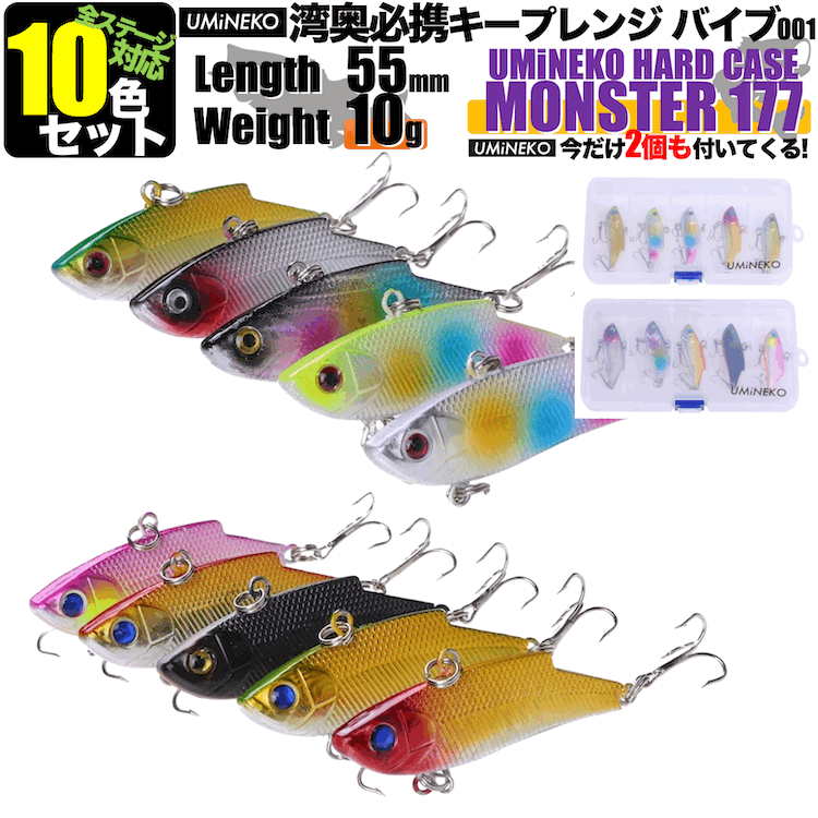 ■仕様 セット内容: ・バイブレーション x 10色 ・ウミネコオリジナルマルチケース MONSTER シリーズ x 2個 ルアー仕様 ・10g(本体長さ55mm) x 10色 ・シンキングタイプ ・カラー:コットンキャンディ パール ホワイト ピンク ブラック レッドヘッド アカキングリーン等 ■ケース仕様 外寸:横17.7 x 縦9.4 x 高3.1cm スペース内寸:長さ9.0 x 幅3.2 x 深さ2.9cm(※真ん中は長さ7cm程度) 特徴: お気に入りルアーを分類できる仕切りタイプ。